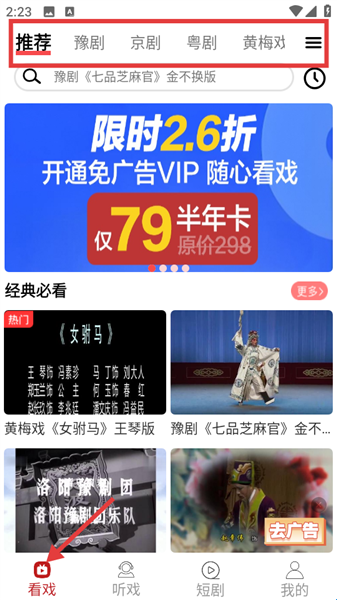 2、APP的看戏页面顶部有推荐、豫剧等分类标签,经典必看板块陈列女驸马等戏曲视频,底部看戏、听戏等导航栏可切换功能模块,助力戏迷便捷找戏曲、享视听。